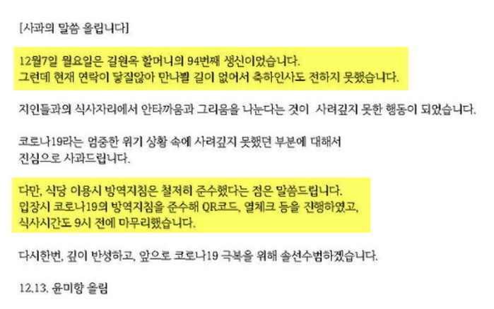 윤 의원은 “진심으로 죄송하다”라면서 “방역 지침은 준수했고, QR코드, 열체크 등을 진행하고 9시 전에 마무리했다”라고 말했다.