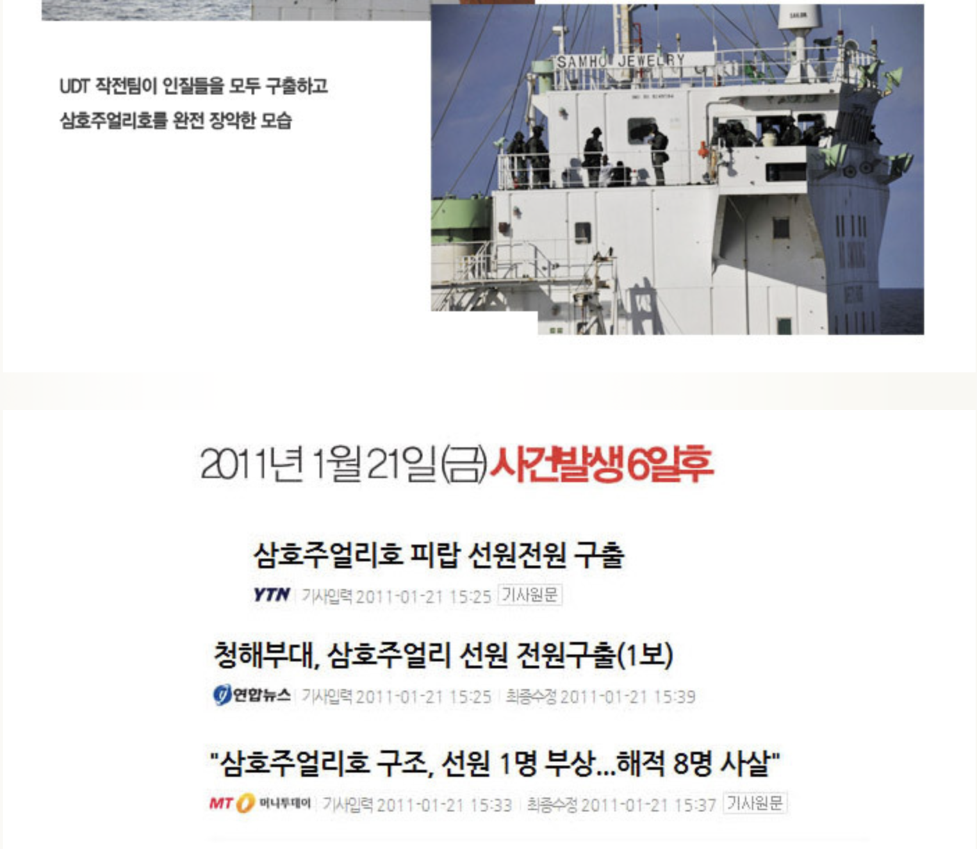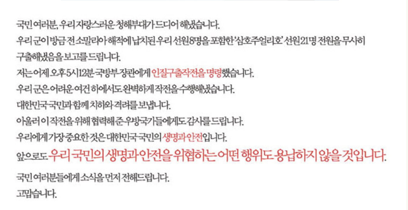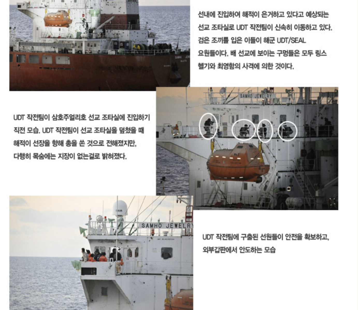 납치 6일 만인 2011년 1월 21일 청해부대 소속 UDT/SEAL 팀의 급습으로 해적 8명 사살, 5명 생포와 동시에 인질 21명 전원 구출의 성과를 낸 우리군이 해외에서 수행한 최초의 인질구출 작전이다.