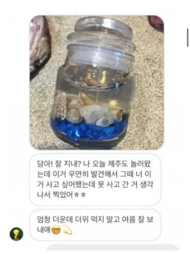 아이유에게 차마 연락을 못하고 있는 가운데 인스타그램을 통해 아이유가 직접 연락이 와 담이씨가 갖고 싶었다고 말했던 ‘제주캔들’의 사진을 찍어 보내며 “제주도 놀러 왔는데 우연히 발견한 제주캔들에 너 생각이 나서 찍었다”며 “여름 잘 지내라”는 메세지를 보냈다.