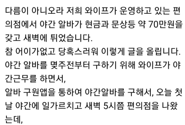 글쓴이는 “저의 아내가 운영하고 있는 편의점 알바생이 현금과 상품권 등 약 70만 원을 갖고 도망갔습니다.”라며 이야기를 시작했다.