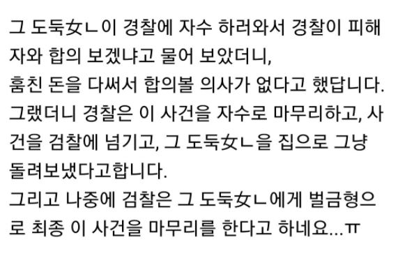 “그런데 그 알바생이 경찰에 자수를 했고, 합의 또한 볼 의사가 없다고 밝혔으며 검찰은 벌금형으로 최종 사건 마무리를 하려고 합니다.”라며 당시 상황을 전했다.