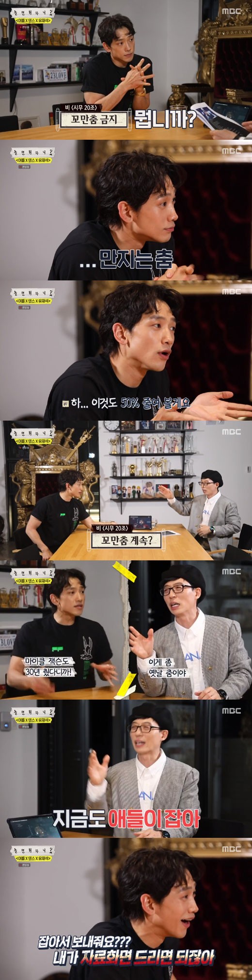 그러나 비는 “이것도 한 50% 빼보겠다. 별 거 없다. 마이클 잭슨도 잡는다. 이건 해야 된다. 마이클 잭슨도 30년을 췄다. 지금도 애들이 잡는다. 잡아서 보내주면 되냐”라며 ‘꼬만춤’은 절대 포기할 수 없다는 입장을 밝혔다.