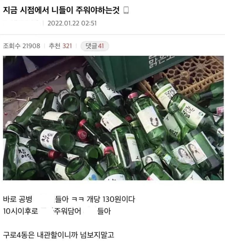 이어 다른 누리꾼은 ‘지금 시점에서 니들이 주워야 하는 것’이라는 제목의 글에는 공변 사진을 첨부하며 “바로 공병 XXX들아 개당 130원이다. 10시 이후로 X나 주워담어 새X들아”라며 “구로4동은 내 관할이니까 넘보지말고”라고 말했다.