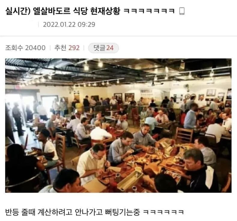 한 누리꾼은 엘살바도르의 식당 사진을 첨부하며 “반등 줄 때 계산하려고 안 나가고 버티는 중”이라고 전했다.