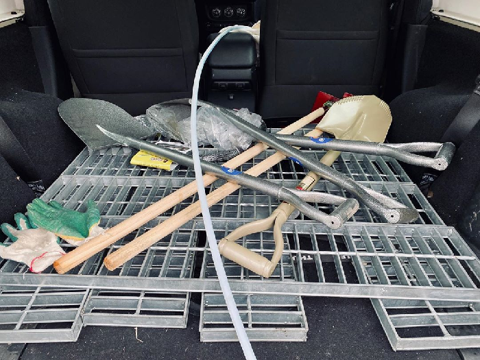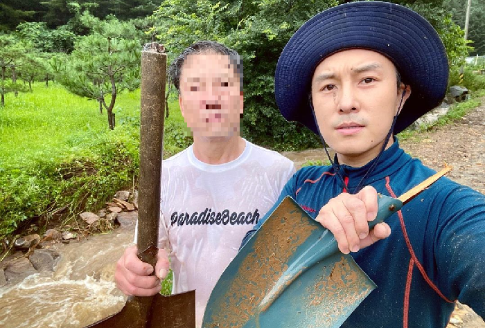 공개된 사진 속 김동완은 부서진 삽을 들고 심각한 표정을 짓고 있다. 그의 뒤에는 흙탕물이 폭포처럼 거세게 흐르고 있다.