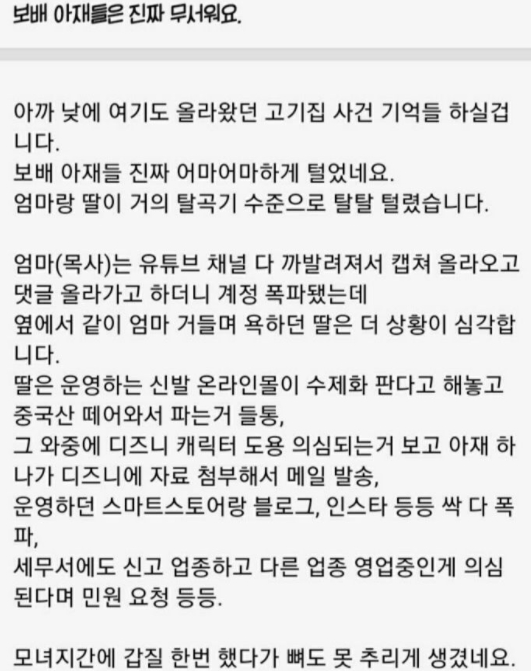 지난달 26일 모녀는 고깃집에서 식사 후 카운터에 찾아와서 불만을 토로했는데 어이없게도 신종코로나시국 상황에서 자신의 옆에 다른 손님이 앉았다는 것이 이유였다.