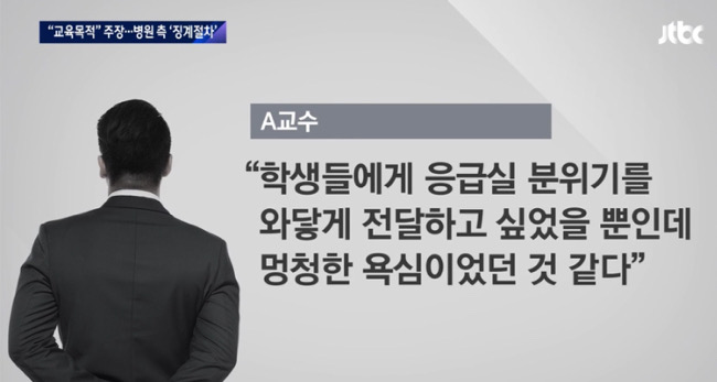 이 같은 동영상의 촬영은 환자의 동의를 받지 않은 것으로 알려졌고 A교수는 “교육 목적으로 촬영하고 업로드한 것”이라말하며 “학생들에게 응급실의 분위기를 직접적으로 전달하고 싶었을 뿐이었는데 멍청한 욕심이었다”고 이야기했다.