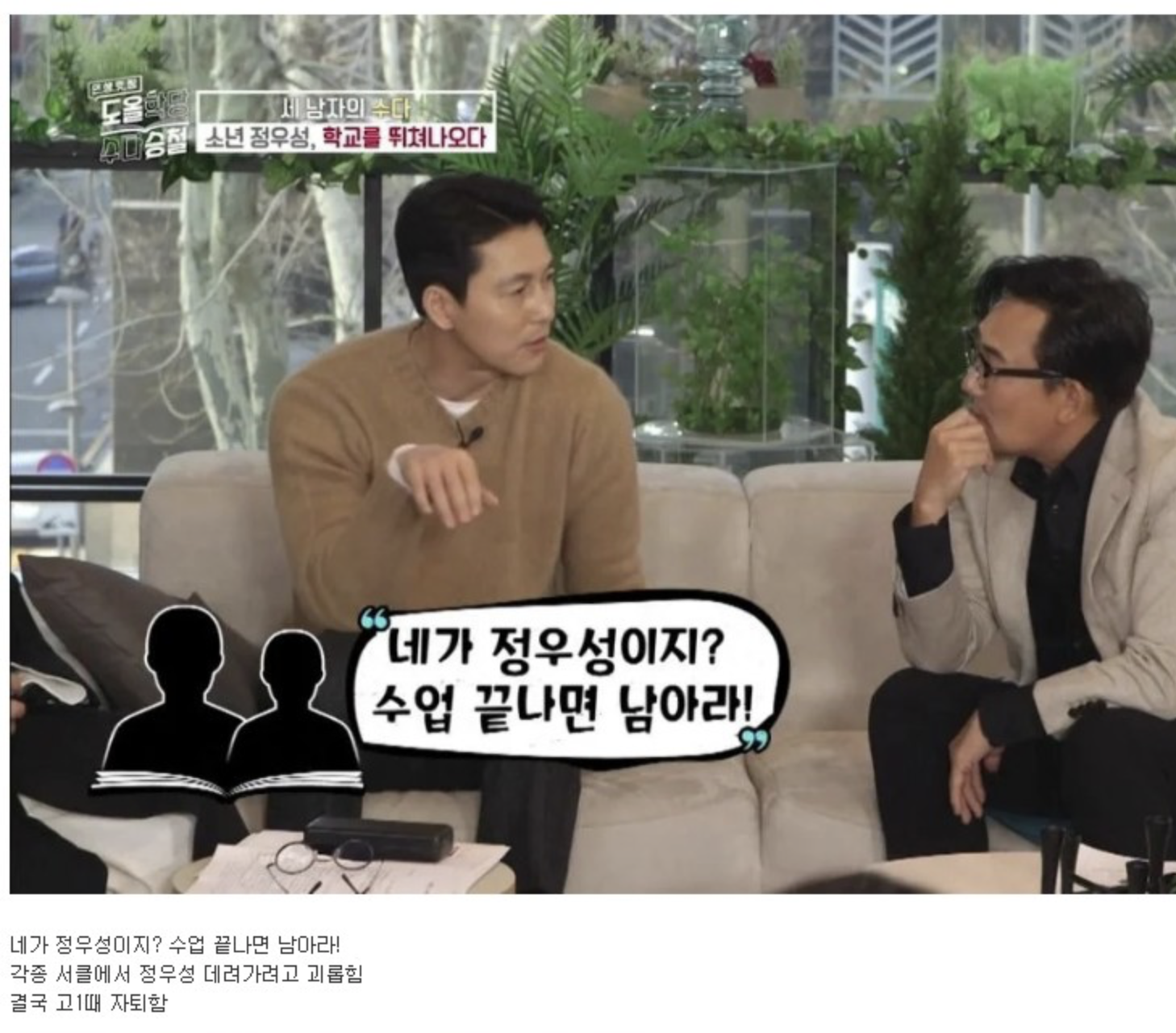 사연의 주인공은 바로 잘생김의 대명사 정우성과 심형탁이었다. 잘생긴 외모로 학교에서 튀었기 때문에 괴롭힘의 타겟이 된 것이었다.
