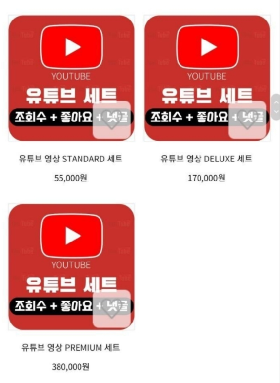 영상 Premium 세트는 38만원에 판매되고 있었으며, 유튜브 채널 구독자, 동영상 조회수도 각각 판매하는 중이었다.