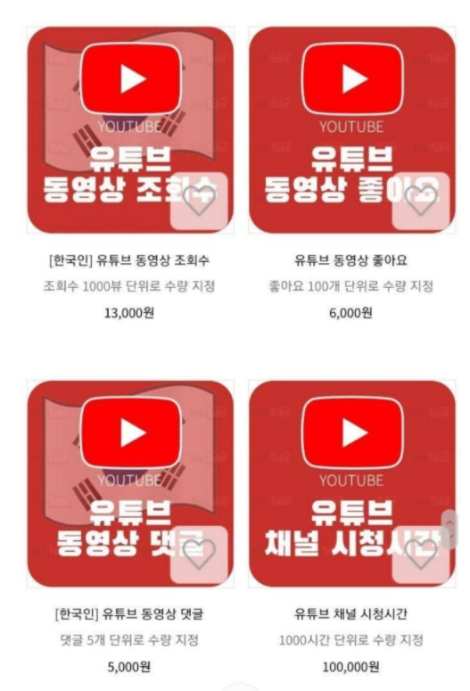 댓글과 채널 시청시간도 판매 중이었으며, 작성자는 “요즘 백만 유튜버가 많이 보이는데 이런 업체들한테 용역을 맡긴다”며 “보통 구독자는 VPN 돌려서 가짜 구글 계정으로 올려주고 댓글은 직접 손으로 달아준다”고 전했다.