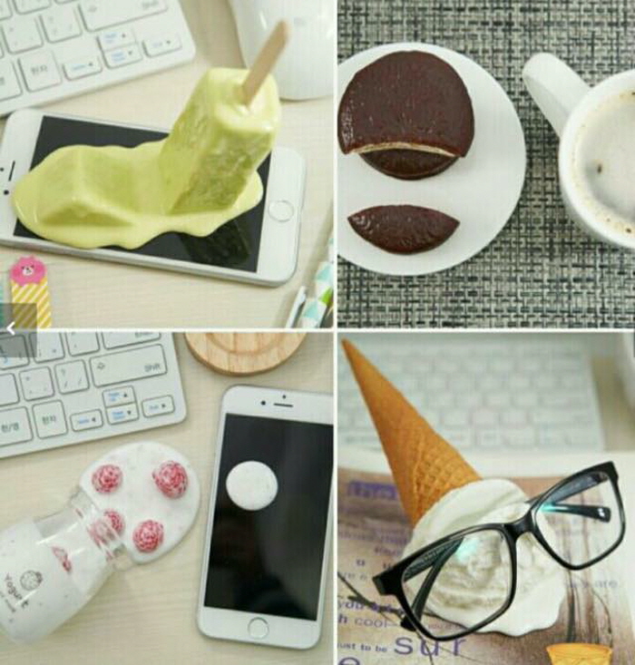 이렇게 실감나는 음식 모양의 휴대폰 거치대는 요거트 뿐 아니라 초콜릿맛 과자, 와플, 핫도그 등 다양한 버전으로 판매되고 있다.