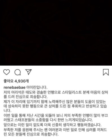아이린은 sns를 통해 죄송하다며 사과문을 게재했다.