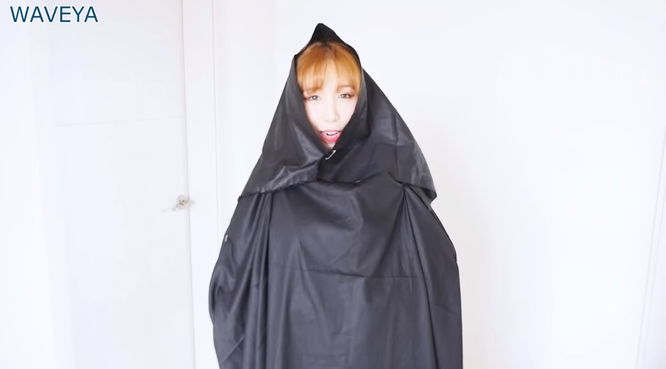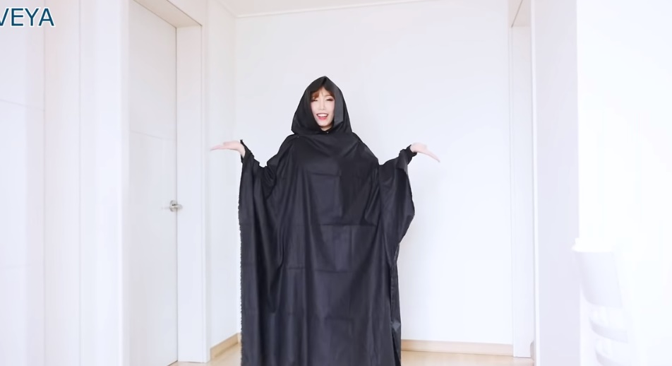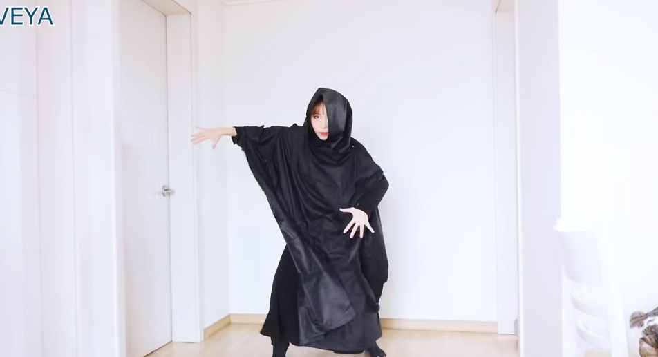 웨이브야는 몸에 딱 붙는 원피스를 입고 등장했는데, 이내 그 위에 검정 망토를 입고 안무 강습을 시작했다.