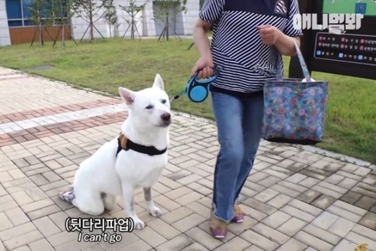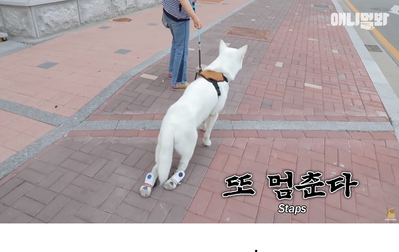 호돌이는 뒷다리에 양말과 신발을 신고 산책을 나갔음에도 네 발로 걷지 못했다.