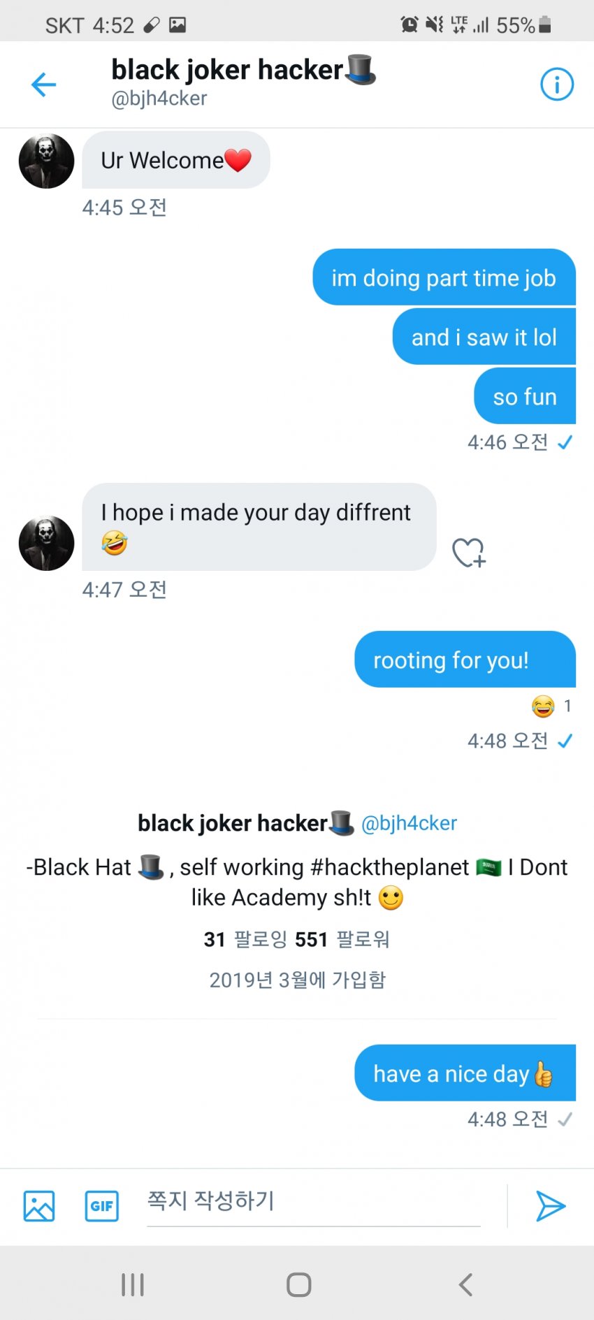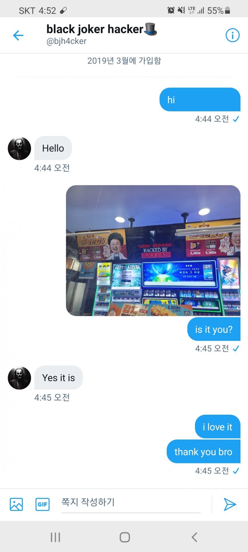 결국 글쓴이는 해킹된 광고판에 적힌 연락처로 해커에게 연락을 했고, 대화를 나눈 후 “설마 제 폰도 해킹을 하진 않겠죠? 그래도 저는 아르바이트라서 크게 상관없네요.”라고 자신의 심정을 밝혔다.