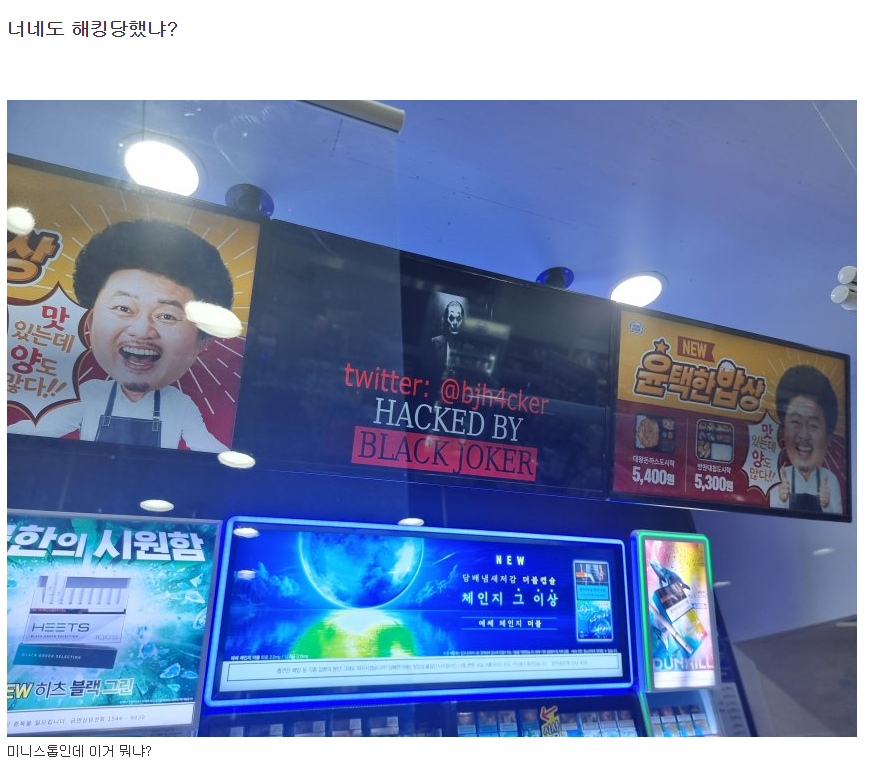 글쓴이는 편의점에서 아르바이트를 하던 중 편의점 담배코너 위에 있는 광고판을 해커가 해킹을 하여 큰일이 났다고 이야기를 시작했다.