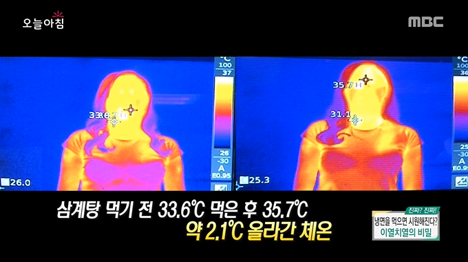 이날 방송에선 리포터가 냉면과 삼계탕을 섭취하며 어느 쪽이 체온 감소에 효과를 주는지를 관찰했다.