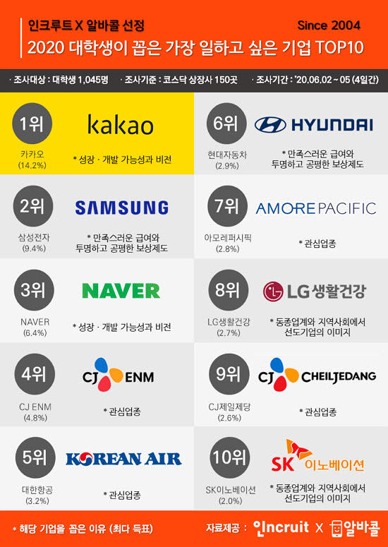 카카오가 삼성을 재치고 ‘2020년 대학생이 꼽은 가장 일하고 싶은 기업’ 1위에 올랐다.