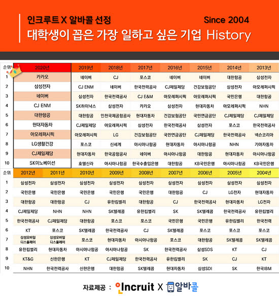 취업포털 인크루트는 2004년 이후 17년째 신입 구직자 대상으로 가장 입사하고 싶은 기업을 설문 조사를 통해 발표해왔다.