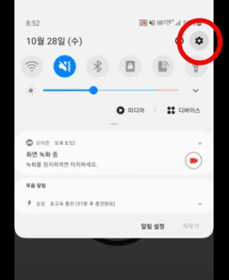 안드로이드 스마트폰 화면서 스크롤을 내린 뒤 작은 톱니 모양을 눌러서 [설정]으로 들어가면 된다.