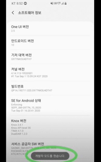 그러다보면 “개발자모드가 켜졌다”는 메시지가 뜨면 성공한 것.