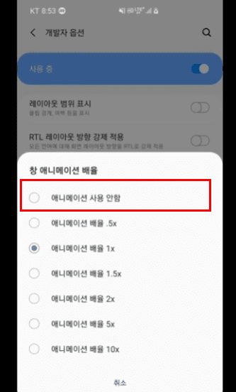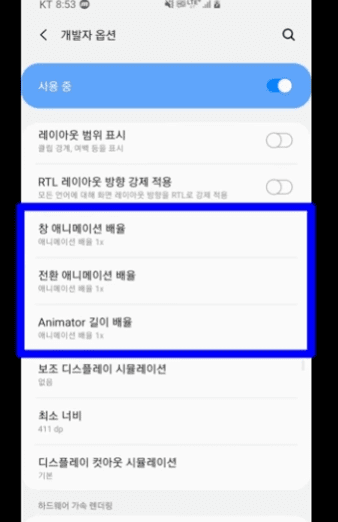 이렇게 하면 [개발자 옵션]이 생기는데 개발자 옵션을 누르면 중간 부분에 [창 애니메이션 배율], [전환 애니메이션 배율], [Animator 길이 배율]라고 뜨는데 배율을 조정할 수 있고 3개 모두 [애니메이션 사용 안함]을 누르면 끝이 난다.