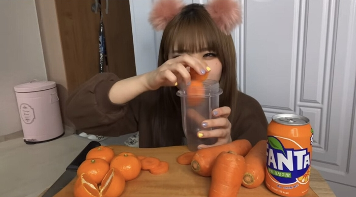해당 영상 속에서 산범은 혼자 등장해 당근을 믹서기에 갈아 오렌지맛 탄산음료와 함께 섞어 마시는 먹방을 공개했다.