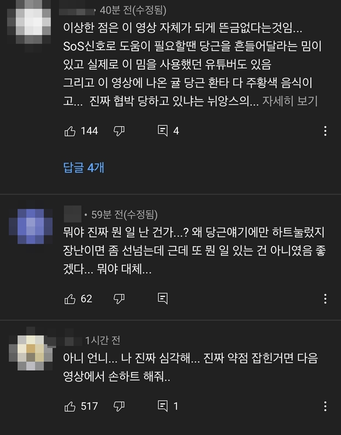두 사람 사이를 의심하는 사람들은 해당 댓글에 동조하며 영상에 “당근을 흔들어주세요 그거 아니냐”, “언니 나 알아들었어 약점 잡힌거지? 당근 흔들어준거지?”, “아니 언니 나 진짜 심각해 진짜 약점 잡힌거면 다음 영상에서 손하트 해줘” 등 걱정스러운 반응을 보이고 있다.