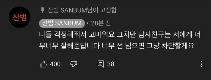 이에 산범은 “다들 걱정해줘서 고마워요 그치만 남자친구는 저에게 너무너무 잘해준답니다 너무 선 넘으면 그냥 차단할게요”라는 댓글을 작성해 영상 댓글 상단에 고정시켜 대응했다.