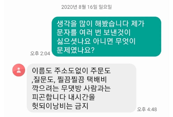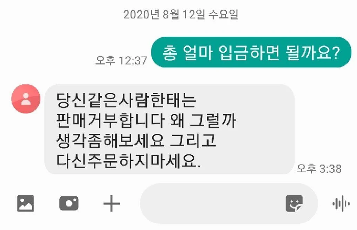 이를 본 판매자는 “당신 같은 사람한테는 판매 거부합니다. 왜 그럴까 생각 좀 해보세요. 그리고 다신 주문하지 마세요”라고 했다.