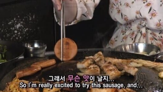영상에서 독일인 여성 ‘우리케’는 삼겹살을 구워 먹다가 불판 한쪽에 놓인 분홍색 어육 소시지도 구웠고 이내 먹기 시작했다.