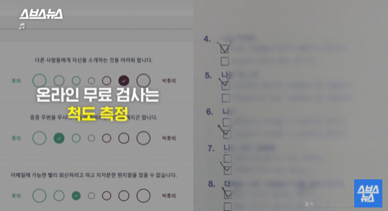 스브스뉴스 팀은 두 가지 검사에 대한 비교 실험을 진행했다. 온라인 무료 검사와 공식 검사 결과가 10명 중 4명이 다르게 나왔다.