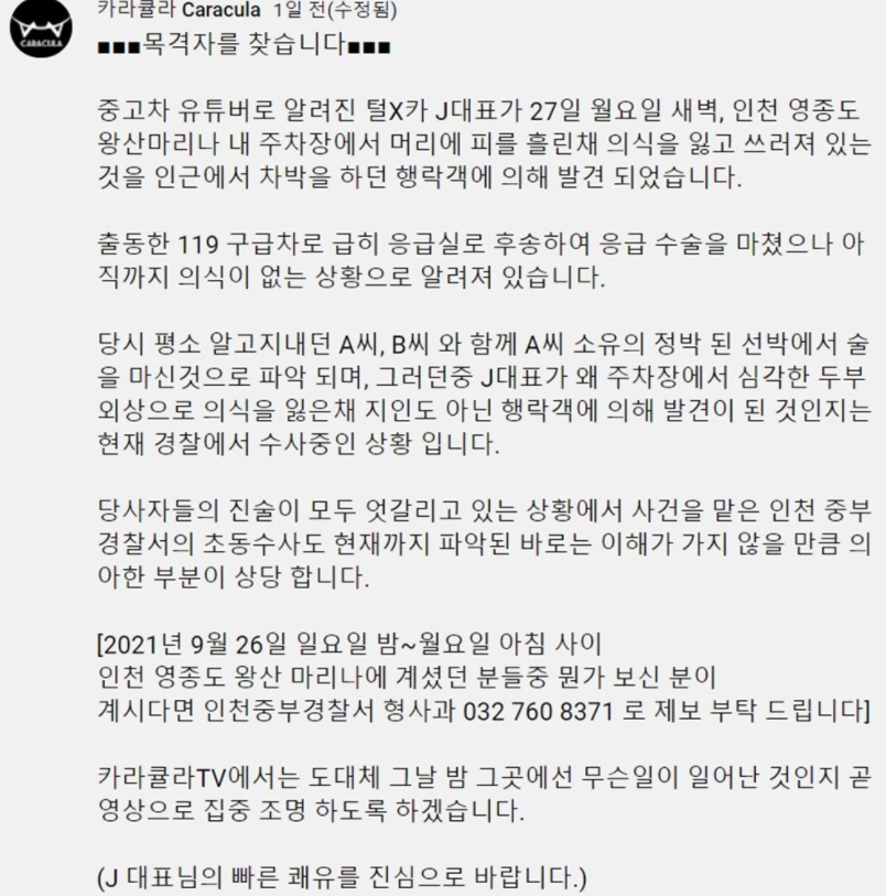 카라큘라는 “중고차 유튜버로 알려진 털X카 J대표가 27일 월요일 새벽, 인천 영종도 왕산마리나 내 주차장에서 머리에 피를 흘린 채 의식을 잃고 쓰러져 있는 것을 인근에서 차박을 하던 행랑객이 발견했다”고 밝혔다.