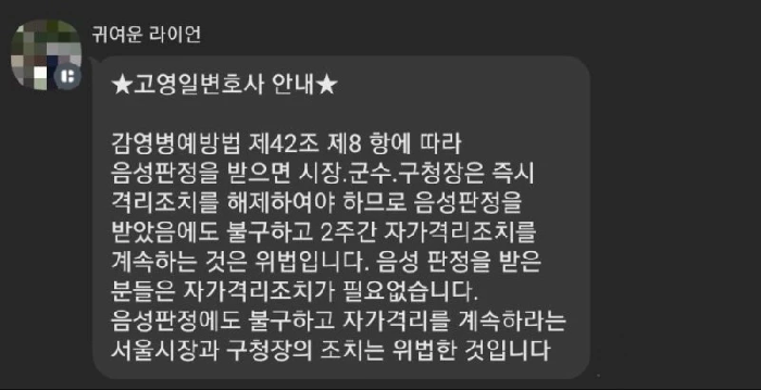 이어 “음성 판정을 받은 분들은 자가격리 조치가 필요없습니다. 음성판정에도 불구하고 자가격리를 계속하라는 서울 시장과 구청장의 조치는 위법한 것입니다”라고 했다.