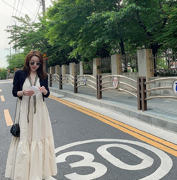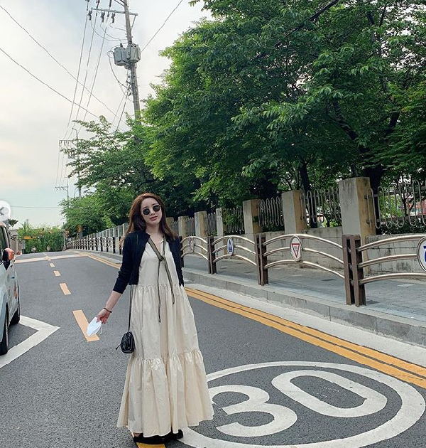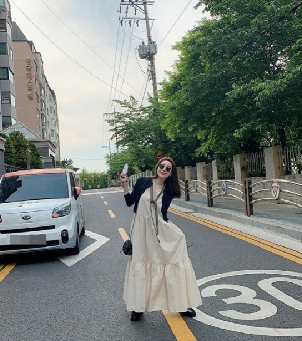해당 사진에서 서인영은 베이지색 롱원피스를 입고 포즈를 취했다.