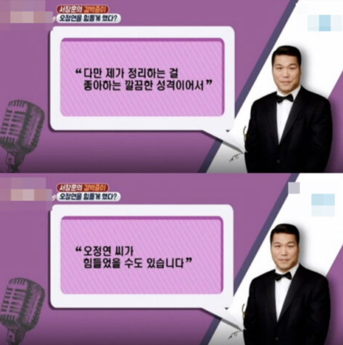 MC 신동엽은 이러한 사연을 보자 절친 서장훈을 언급하며 “오염 강박 때문에 집에 어느 누구도 초대하지 않는다. 늘 만나면 바깥에서 만나야 한다”라 서장훈을 언급했다.