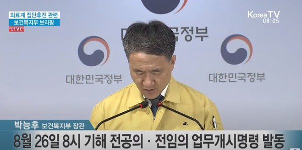 26일 박능후 보건복지부 장관은 정부서울청사에서 열린 브리핑에서 “정부는 오늘 오전 8시 기해 서울, 경기, 인천 등 수도권 소재 수련병원에 근무 중인 전공의, 전임의를 대상으로 즉시 환자 진료 업무에 복귀할 것을 명령했다”라고 밝혔다.