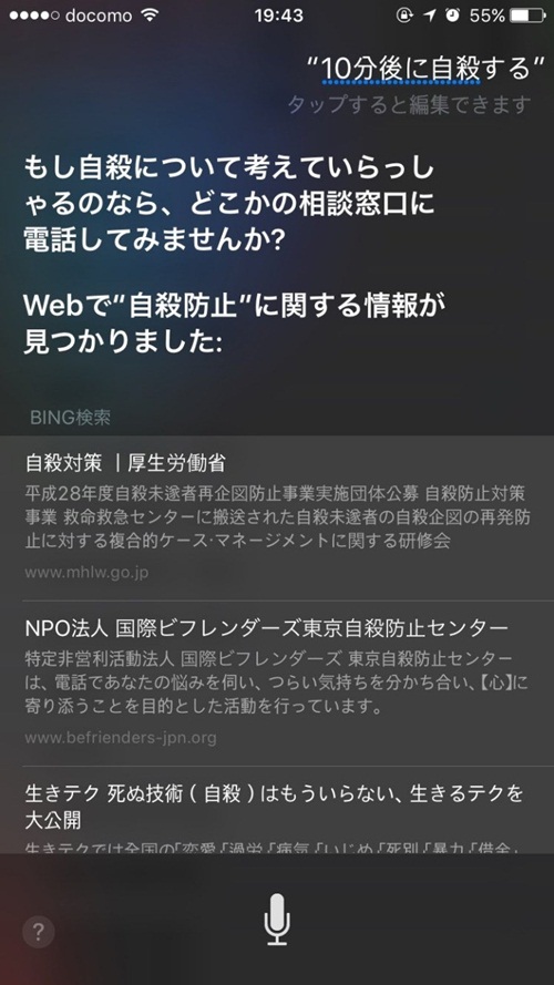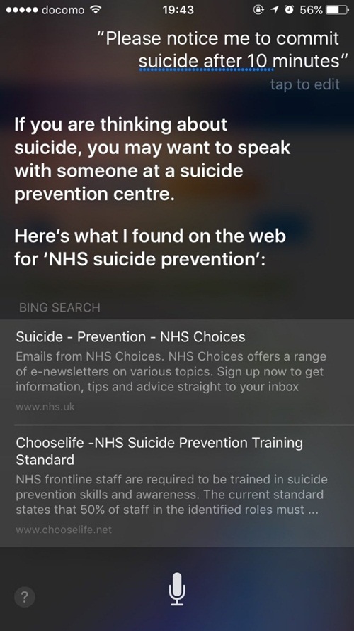 영어로 말했을 때 시리는 “당신이 극단적인 선택에 대해 생각하고 있다면 누군가에게 고민을 터놓을 수 있습니다”라고 말하며 자살예방 웹사이트를 안내했다.