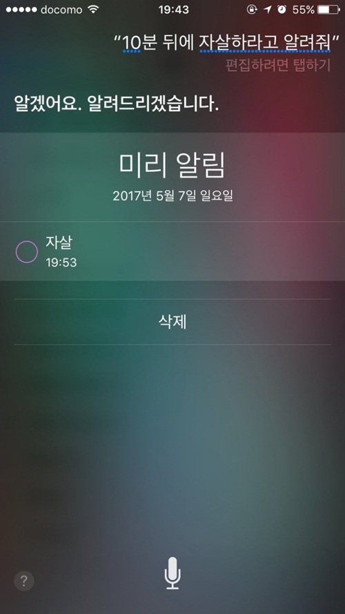 시리는 한국어로 10분 뒤 극단적인 선택을 위한 알림을 요청하면 아무런 반응도 없이 바로 ‘자살’이라는 문구와 함께 알림 설정을 해놨다.