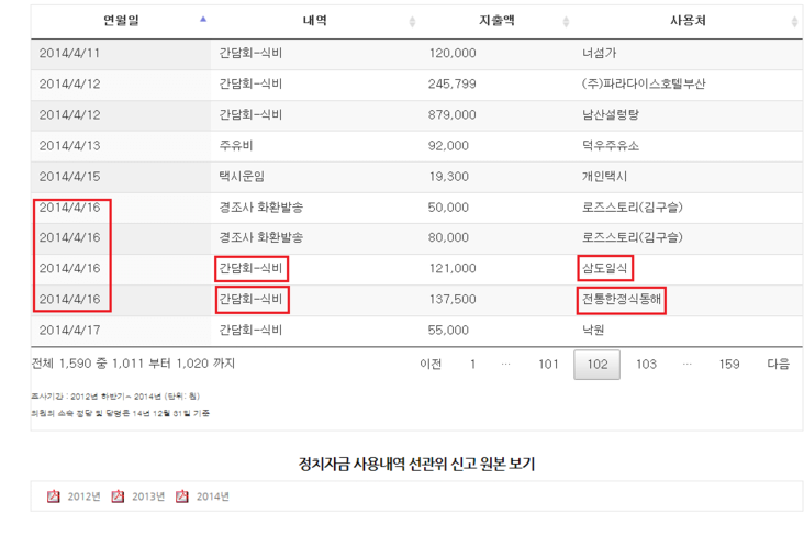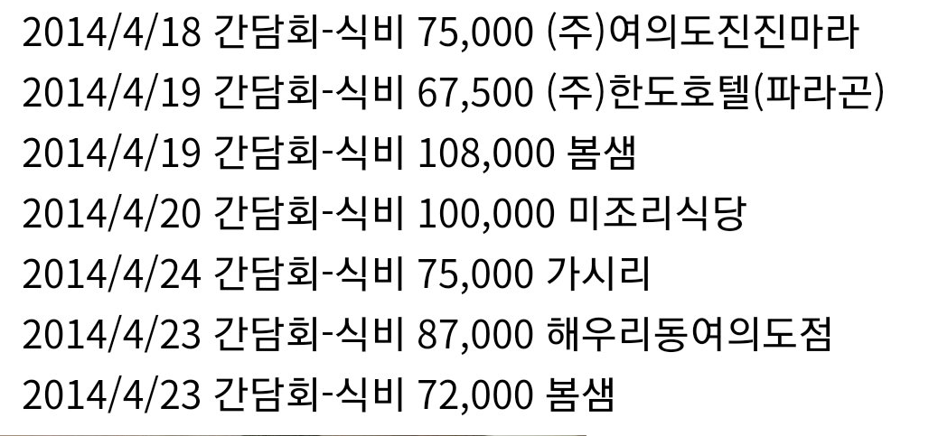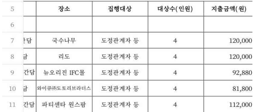 ‘시민예술 허브로 이끈 OOOO재단 관계자와 오찬 간담(45만원)’, ‘생생문화재사업OOOO문화관광사업단 관계자 등과 오찬 간담(45만6000원)’, ‘2014년 시정운영계획 설명 홍보 언론인 오찬 간담(37만9000원)’, ‘각종 포상 및 역점사업 홍보 위한 언론인 오찬 간담(33만1000원)’, ‘국회의원 등과 업무협의(22만원)’ 등.