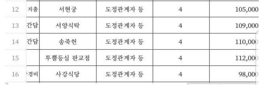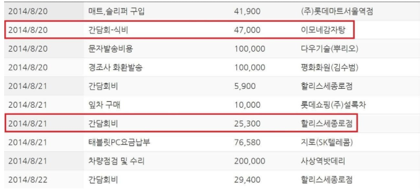 업무추진비 내역 중 ‘부속실 방문 민원 접대용 다과물품 구입’ 항목으로 지출된 것은 230여건인데 이중 200여건이 성남시청이 있는 여수동이 아닌 정자동, 야탑동, 서현동 등에서 지출됐다.