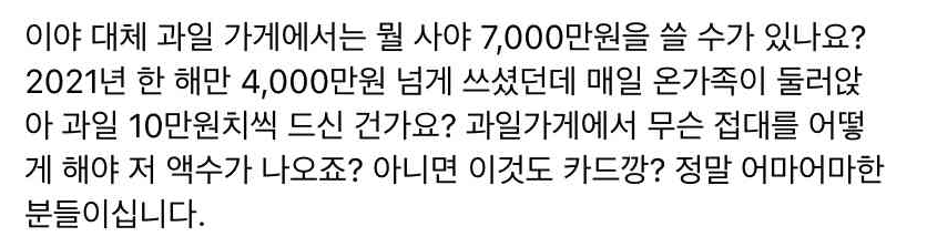 1년에 과일가게에 4천만원쓰고 총 7천만원 사용 ㅋㅋㅋㅋㅋㅋ