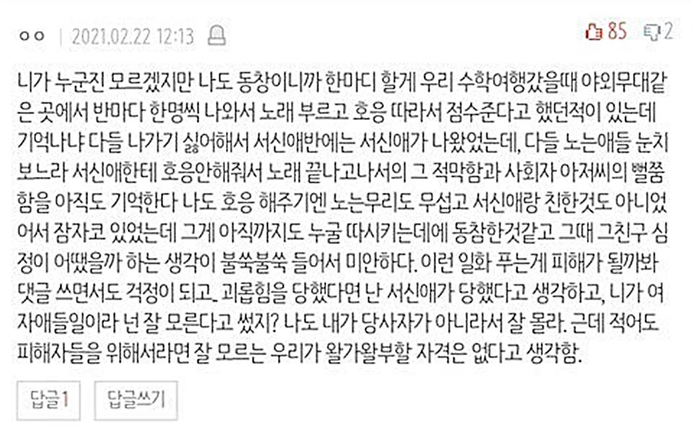 그는 서신애가 학교폭력을 했다는 게시글 내용을 반박하며 댓글을 달았다.