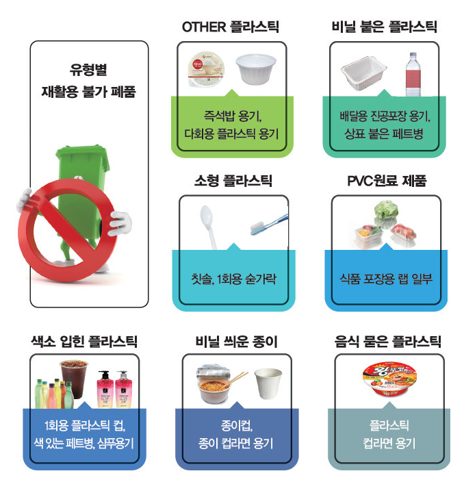 재활용 가능 물품의 기준은 대체적으로 전 세계가 동일하지만, 그 분류법은 나라별로 천차만별이라서 한국에서는 재활용품들도 유리, 금속, 플라스틱, 종이 등 세세한 범주로 분류하지만 외국에서는 이런 구분 없이 그냥 ‘재활용/일반쓰레기’로 나누어져 있는 곳도 많다.