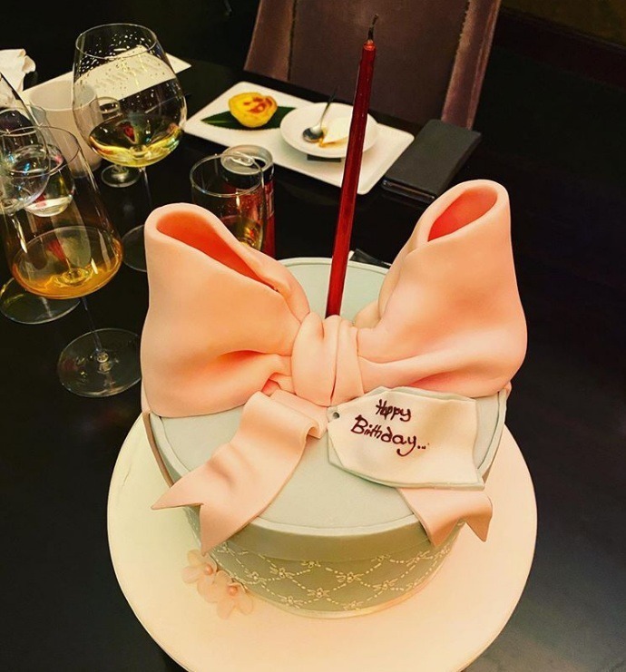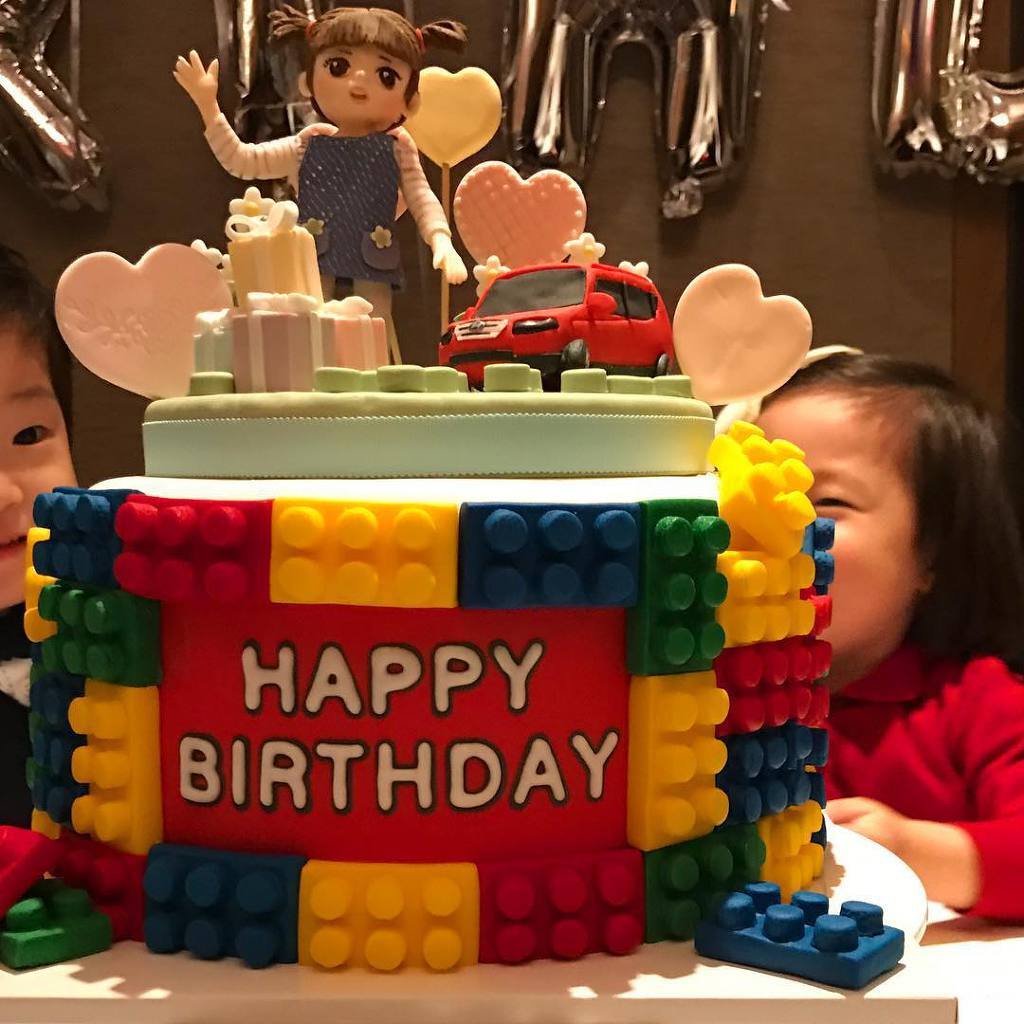 또 다른 케이크에는 커다란 리본이 장식되어 있었고, 블록 모양으로 아기 만화 캐릭터인 콩순이도 장식되어 있었다.
