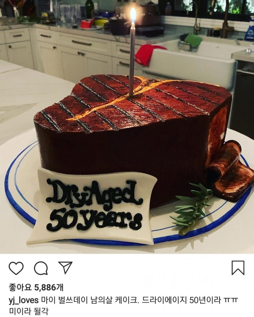 정용진은 “마이 벌쓰데이 남의살 케이크. 드라이에이지 50년이라 미이라 될각”이라고 말했다.