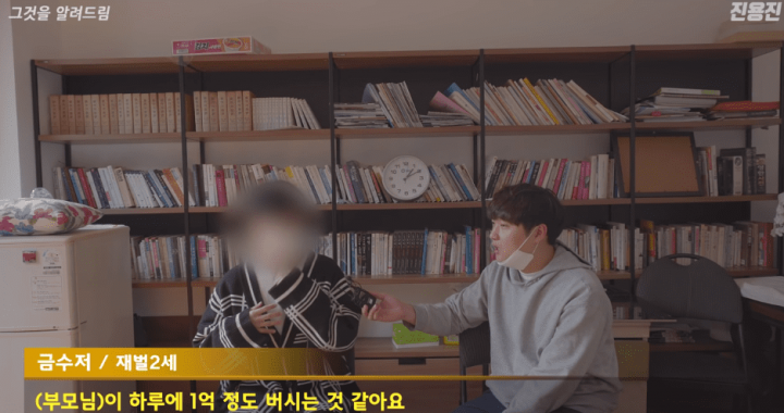 영상 속 유튜버 진용진은 궁금증을 해결하기 위해 직접 자수성가한 사람, 금수저, 재벌 2세등을 직접 만나러 갔는데 먼저 재벌 2세의 집을 찾아갔다.