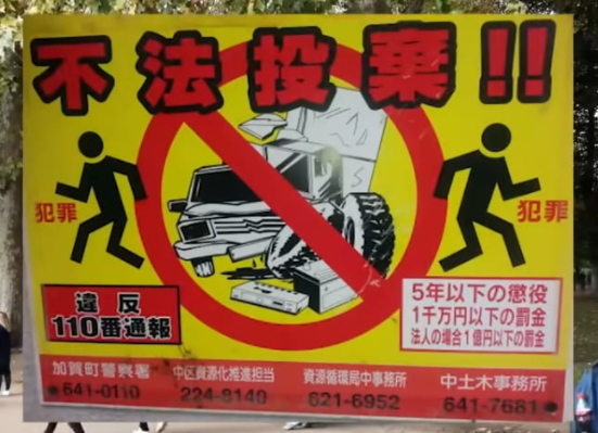 해당 표지판에는 “쓰레기 불법 투기 시 1000만엔(1억 원) 이하의 벌금 또는 5년 이하의 징역”이라고 경고하는 문구가 적혀져있다.
