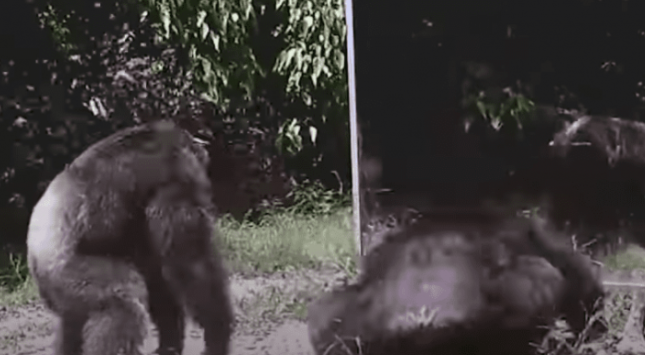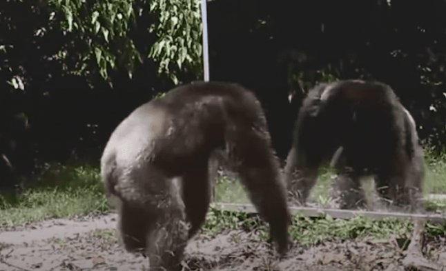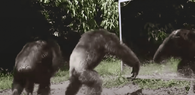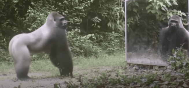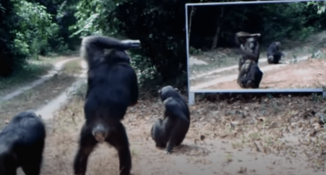 침팬지에게 거울을 보여주자 침팬지는 자신의 모습을 알아보지 못하고 감정이 흥분한 상태로 날뛰었다.