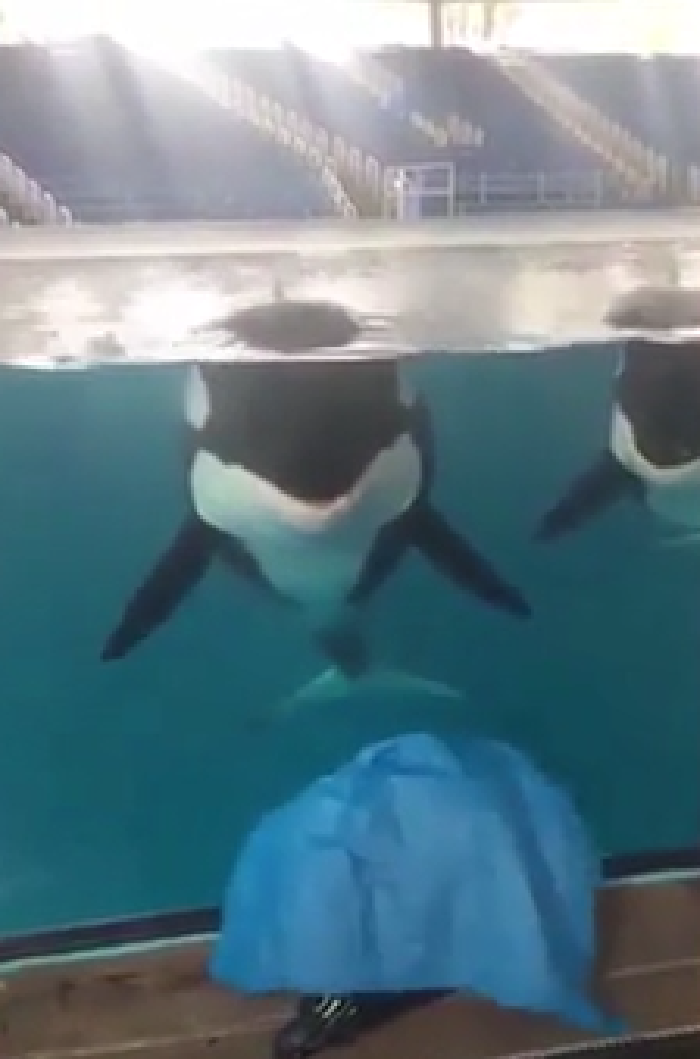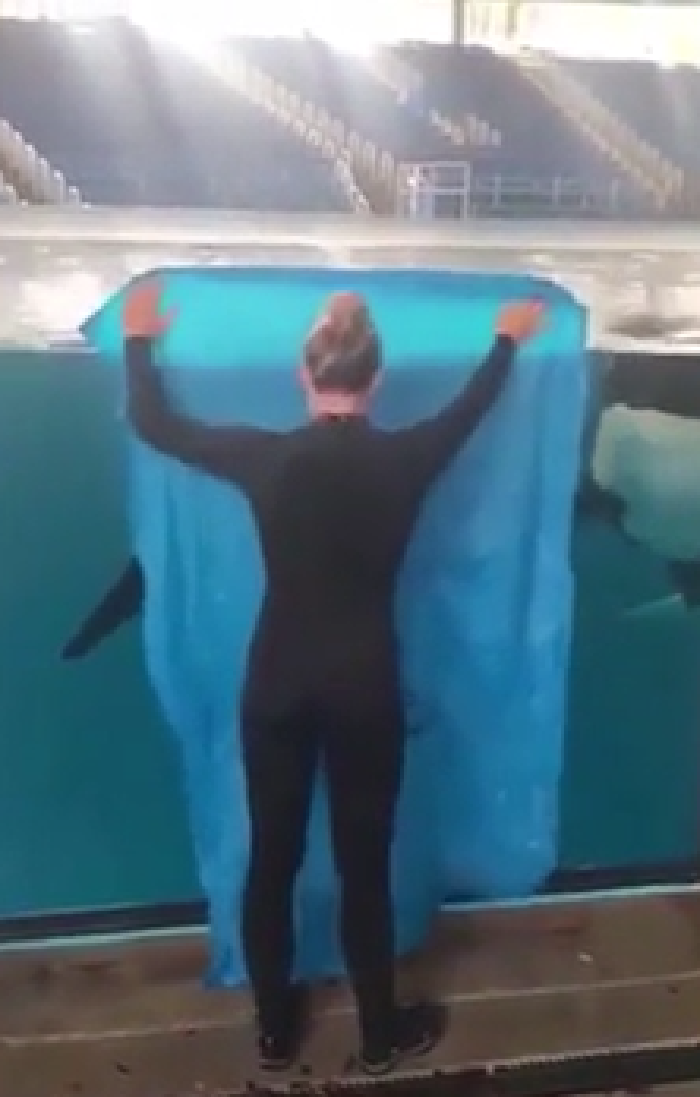 사육사는 범고래의 탱크 앞에서 파란색 시트로 몸을 가렸다.